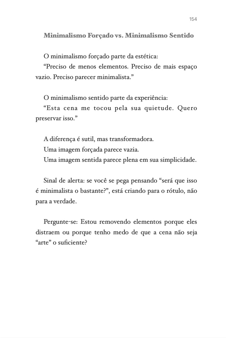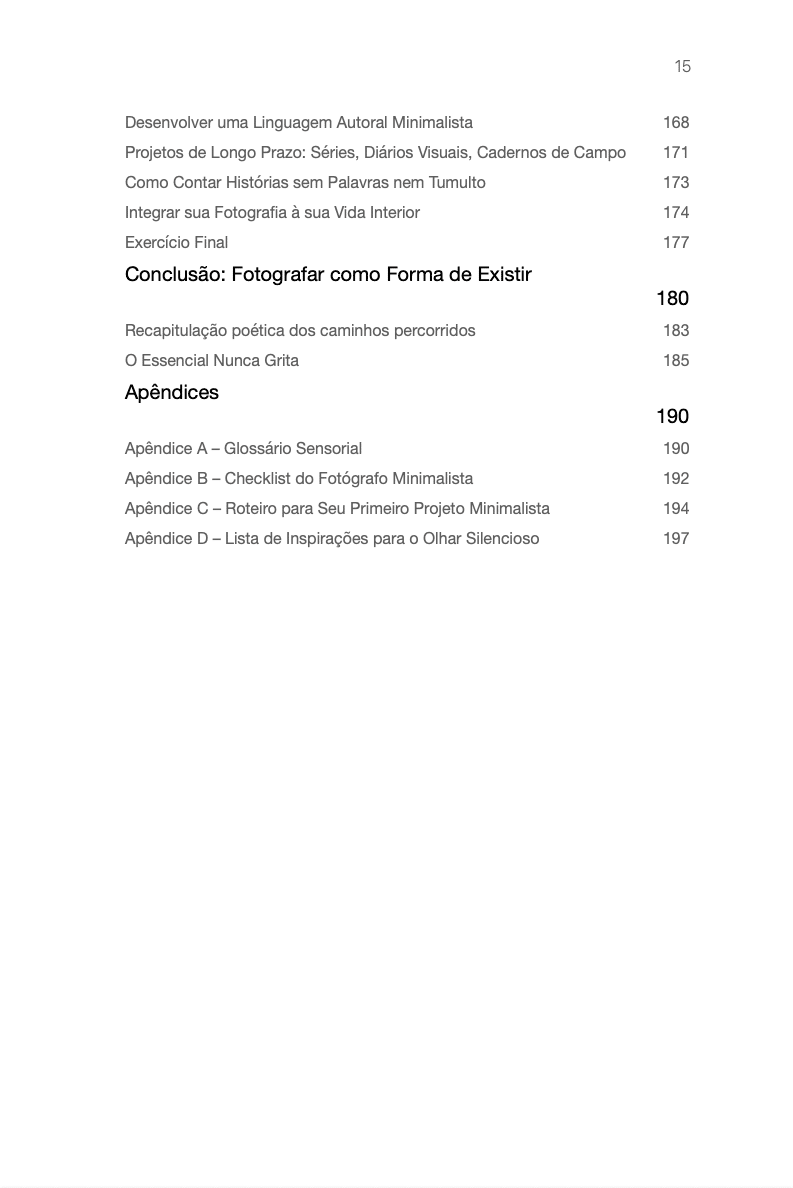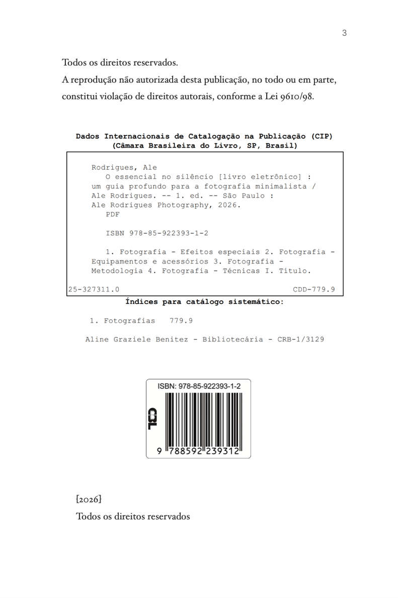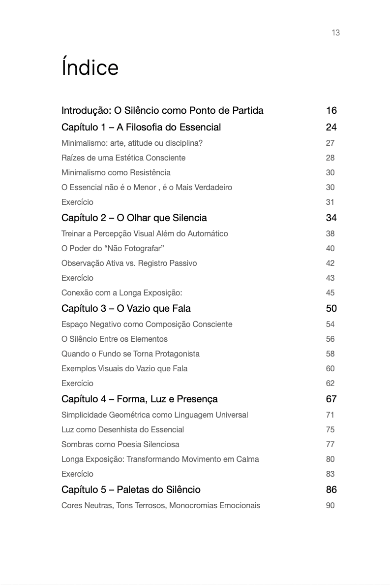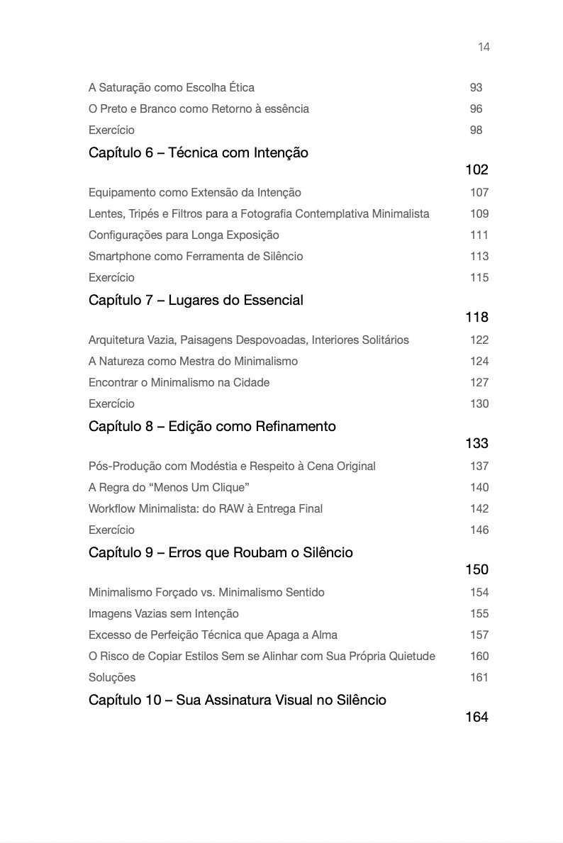 O que você encontrará aqui: - 10 capítulos escritos como cartas contemplativas, não como aulas - Mais de 50 fotografias autorais das séries “Nenhum Lado, Todo Lado”, “Pureza” , "Minimalismo Litorâneo", "Dinâmica da quietude", entre outras, cada uma com legenda poética e intencional - Reflexões profundas sobre: • O espaço vazio como linguagem • A longa exposição como ato de entrega • Os erros invisíveis que roubam o silêncio • A edição com modéstia • E, acima de tudo, como construir sua assinatura visual autoral não copiada, mas sentida
