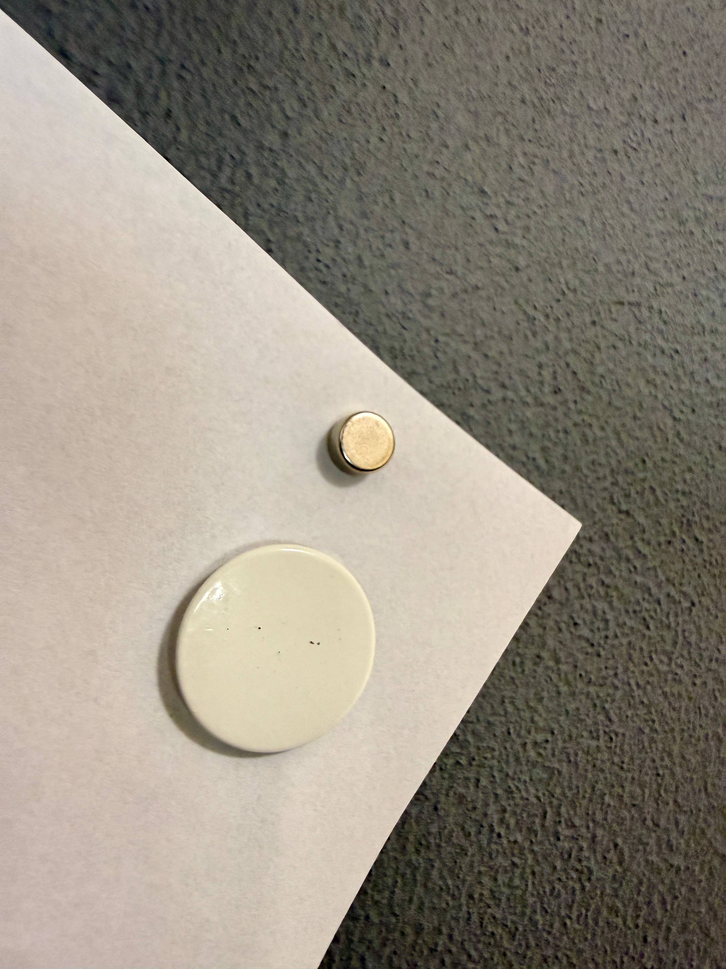 Aqueles imãs comuns são muito fracos e nem com 5 demãos seguravam uma folha, aí tive que utilizar imãs de neodímio, que são mais fortes.