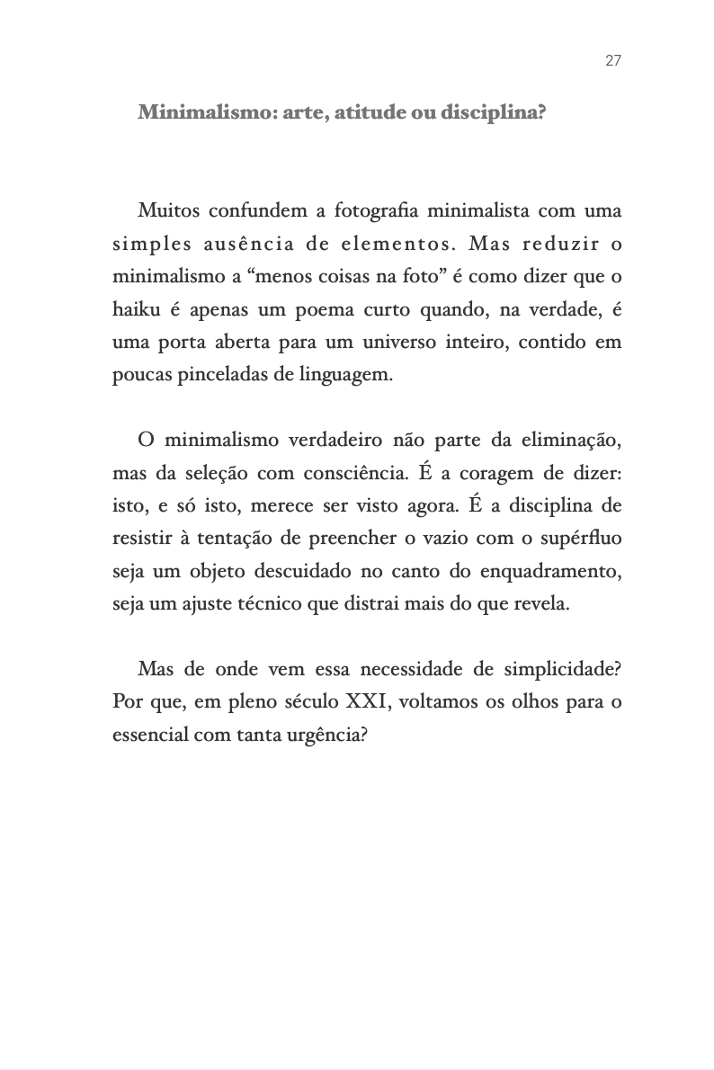 O Essencial no Silêncio - Um guia Profundo para a Fotografia Minimalista Um e-book para quem já sabe como fotografar e agora busca por quê.